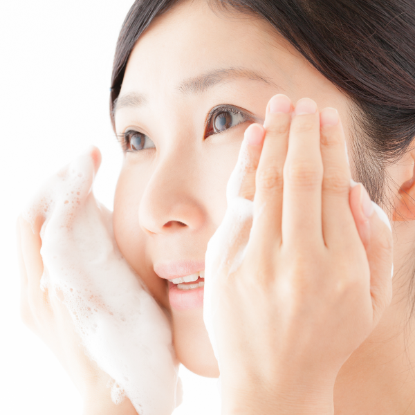 泡立ちネットでたっぷりと泡を作り、お顔に泡を押し当てて汚れを吸着させます。泡がなくなるまで1〜2分かけて丁寧に繰り返し押さえ、最後にぬるま湯でしっかりすすぎます。